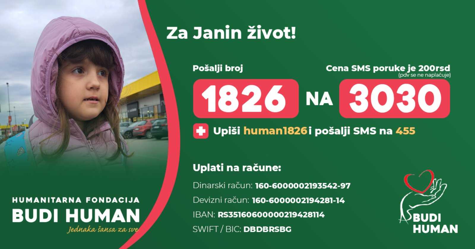 Jana, koja ima svega pet godina, boluje od agresivnog tumora na mozgu – glioblastoma. Nakon što je operisana u Kliničkom centru Srbije, ustanovljeno je da je za dalje lečenje potrebno hitno uključivanje u terapije u inostranstvu, u specijalizovanim klinikama, a za lečenje je neophodno prikupiti oko 500.000 evra.