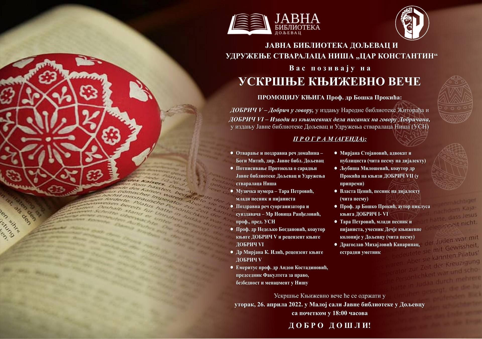 Pored autora prof. dr Boška Prokića, govoriće i mnogobrojni njegovi saradnici, poput prof.dr Nedeljka Bogdanovića, dr Mirjane Ilić, Mirjane Stojanović, advokata i publiciste, Ljubiše Miloševića kao i mnogi drugi.