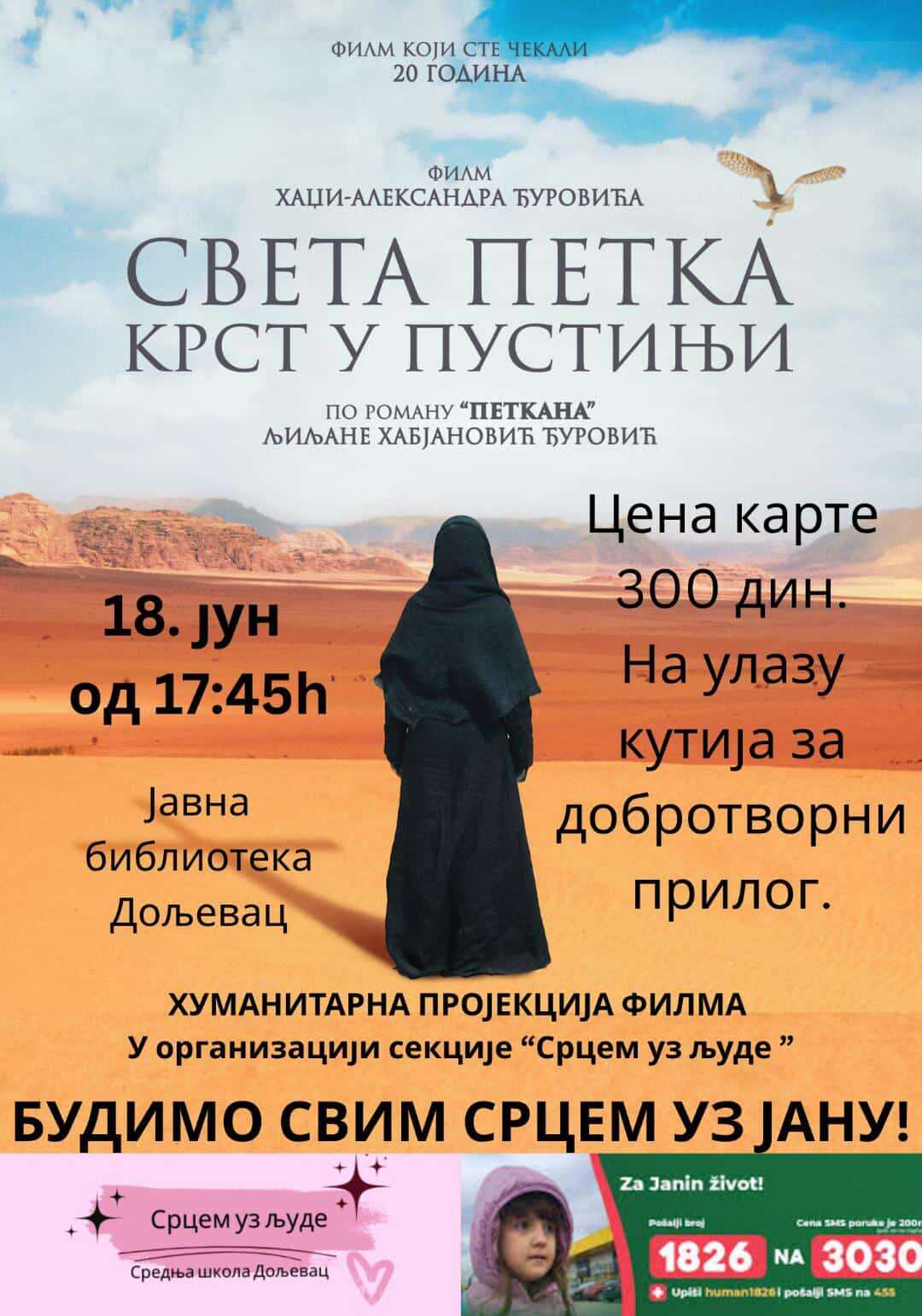 Javna biblioteka Doljevac i humanitarna sekcija „Srcem uz ljude“ Srednje škole Doljevac organizuju humanitarnu projekciju filma „Sveta Petka – Krst u pustinji“ u utorak, 18. juna, sa početkom u 17:45 časova. Cena ulaznice iznosi 300 dinara, a sav prihod biće namenjen za lečenje male Jane Simonović iz Doljevca, koja boluje od teške bolesti.